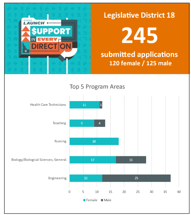 The LAUNCH plan, which provides $8,000 grants for Idaho high school seniors to pursue training for in-demand jobs at Idaho institutions is in its first year and it’s not clear whether it will be funded. It would cost $75 million. It only passed by one vote last session, with a majority of Republicans voting against it, and we expect a funding battle on it this year. It has been very popular with students, though, with 12,500 applicants statewide and 245 applicants from District 18. Here’s what they’re pursuing with these dollars: